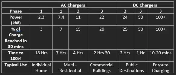 - Power ratings of AC chargers are typically: